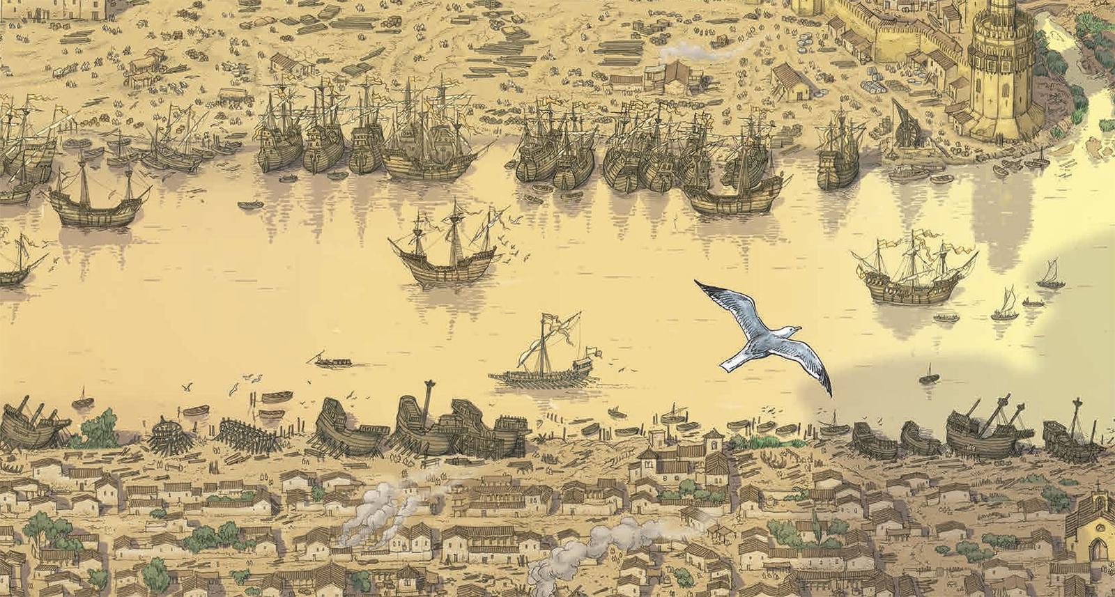 El pueblo, guardando respetuoso silencio, contempló a los tripulantes en su espectral procesión hacia la iglesia, descalzos y esqueléticos como iban, vistiendo túnicas blancas, con cirios encendidos. El mismo pueblo habría oído quizá que el barco iba cargado de ricas mercancías, las especias, más promesas en fin de prosperidad para los habitantes de la ciudad. Sin embargo, no solo riquezas materiales venían en el Victoria, también otras más intangibles y a su vez menos perecederas: era un barco cargado de nuevos conocimientos. No solo un descubrimiento geográfico concreto, una nueva ruta para llegar a las Islas de las Especias desde Occidente, sino todo un cambio en la concepción del mundo, de un planeta al que se le daba la vuelta de manera oficial por primera vez. El replanteamiento de la realidad es a nivel espacial, pero también a nivel temporal: el cronista y superviviente Antonio Pigafetta se sorprenderá de hecho cómo habían perdido un día por viajar siempre dirigiéndose al oeste. Las notas que en su diario registra Pigafetta sobre este fenómeno, serán motivo de inspiración, casi 35o años después, para Julio Verne a la hora de escribir sobre otra famosa vuelta al mundo, la que Phileas Fogg realizó en solo 80 días. Ilustraciones: Artefacto/ Arturo Redondo
